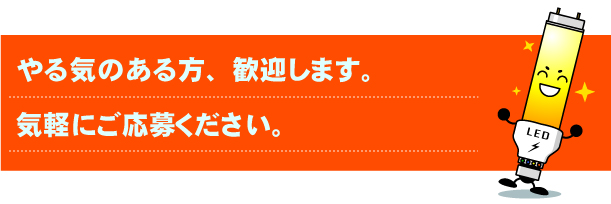 | 募集職種 | 営業 若干名 今の仕事に不満のある方、もっと大きな仕事をしたい方。 今の仕事で人一倍実績を上げているがもっと成長したい方。 LED照明はこれからさらに発展します。 どこよりも優れた商品を安く販売する当社で営業の腕をさらに磨いてください。 |