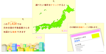 徳島県の住宅不動産のホームページ/FLASH制作です。まず、使い方を簡単に説明した後、各都道府県をクリックすると各詳細ページに移動するように作っています。