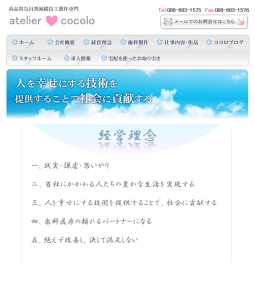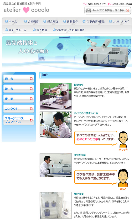 歯科技工物の製作をされているアトリエココロ様のホームページ制作をさせて頂きました。最先端の技術を使った技工物製作、そしてお客様だけでなくスタッフの皆様も大事にされている、ということが分かる楽しいスタッフルームページもございます。歯科技工物の製作をお考えの方は、アトリエココロ様のホームページをご覧くださいませ。