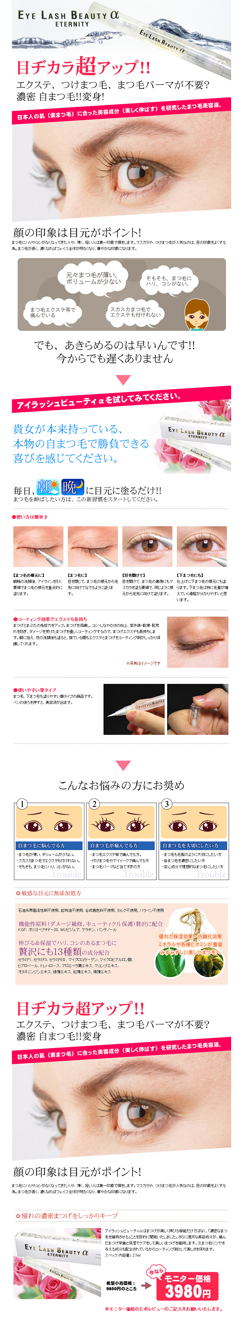 神奈川県の企業様より化粧品の説明ページ作成を1件頂きました。商品の魅力がわかるように上から順番に説明を読んでいく形となっています。はじめに大きくイメージを、次に目元の悩み、使い方、という流れになっています。説明を全て読まなくても、イメージの見出し部分だけ見て頂ければ商品についてのことがよくわかるようにさせて頂きました。私におまかせで、自由にデザインさせて頂き、ありがとうございました。