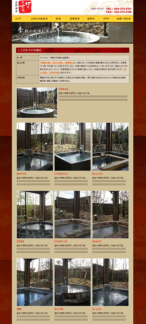 非常にたくさんの温泉が楽しめる施設ですので、それらを活かせるホームページ制作をさせて頂きました。