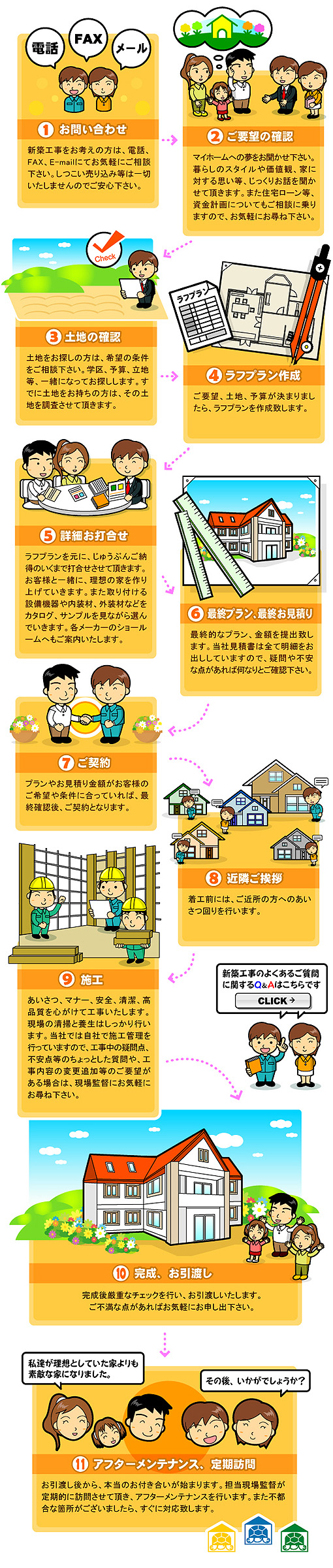 新築、リフォーム工事の流れを分かりやすくイラスト付きで説明しています。