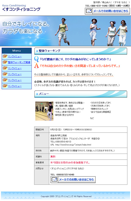 板野郡板野町のくすコンディショニング様よりウォーキングセミナーページ作成のご依頼を頂きました。後々、ページを追加したり、更新されるとの事でしたので、見出しやメニュー部分等、ホームページビルダーにてご自身で作成されやすい形式や構成にさせて頂きました。爽やかな白と青を基調にしています。ウォーキングセミナーや整体等、ご興味のある方は、ぜひご参加ください。