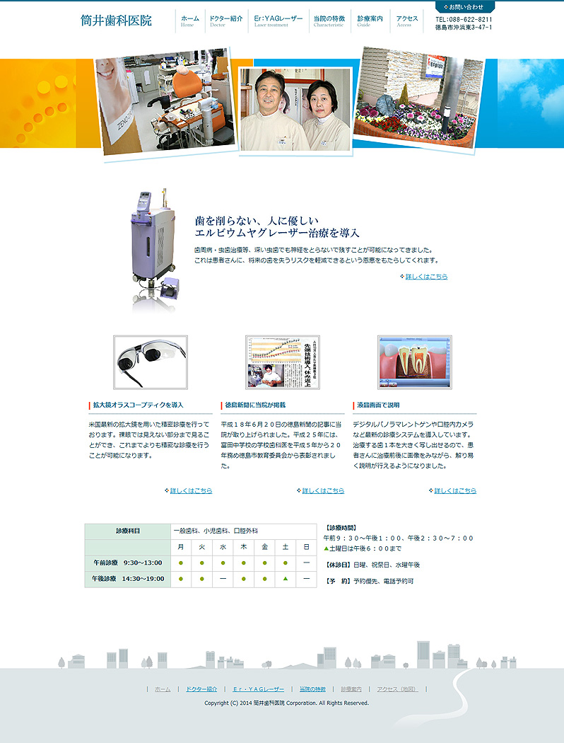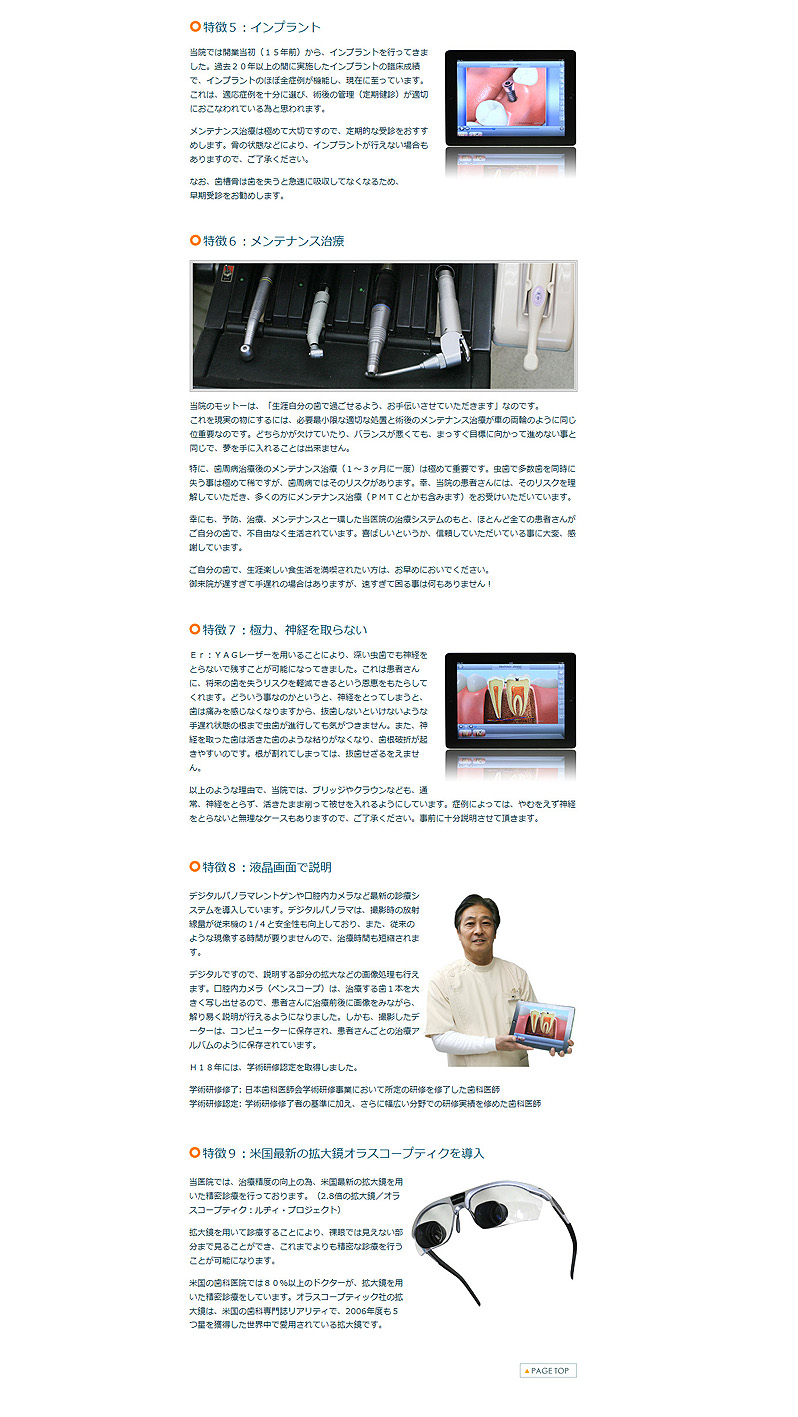 歯科医院様のHPをリニューアルさせて頂きました。白と青で清潔感のあるスッキリとした今風のデザインにさせて頂きました。ドメインは昔から使われているものを、そのまま使用することにしました。TOPページにはテンポよく動きをつけたFLASHを入れています。
