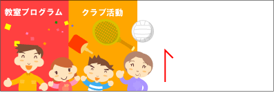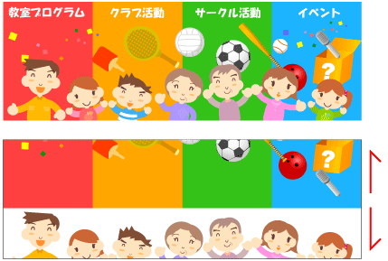 Aここでは、大きな4つの活動内容があります。そして、楽しい雰囲気が伝わるようにしています。下から4つのプログラムのイメージがだんだんとテンポよく出てきます。 |