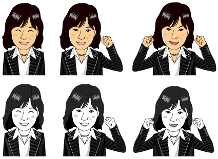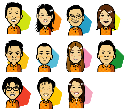 会社スタッフ様、似顔絵イラスト会社スタッフ様の似顔絵イラスト制作です。こちらをベースに笑った顔、驚いた顔、万歳をしているポーズなど、を作成することも可能です。かわいい雰囲気の似顔絵イラストにさせて頂きました。 |