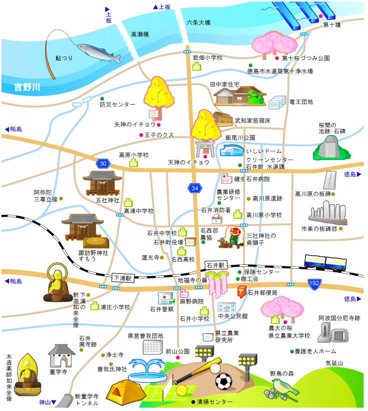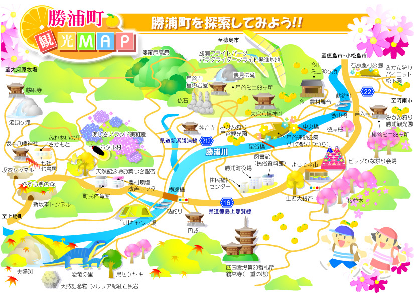 たくさんの観光地を楽しいイラストにします。どこに何があるのか一目で分かります。このイラストマップは、町のホームページで使用されるため、色を識別しにくい方、そして、誰にでも見ていただけるように色は、白、黒と、コントラストのはっきりしたものを使っています。印刷用にも使用できるデータにて作成。
